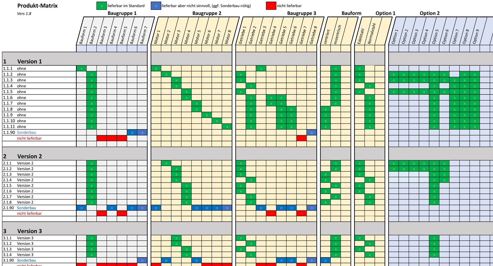 Um die vertriebliche Produktstruktur zu visualisieren, wurden alle Standard-Produkte und deren Varianten in einer Produktmatrix abgebildet.