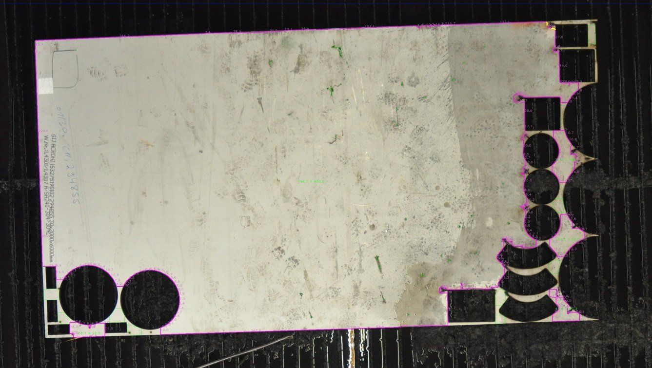 Kontur des Restbleches auf der Maschine optisch erfassen. Die dabei generierte DXF-Datei an das Schachtelsystem übergeben. So kann das noch auf der Maschine liegende Blech sofort erneut verschachtelt werden. Außerdem sollte dadurch erreicht werden: